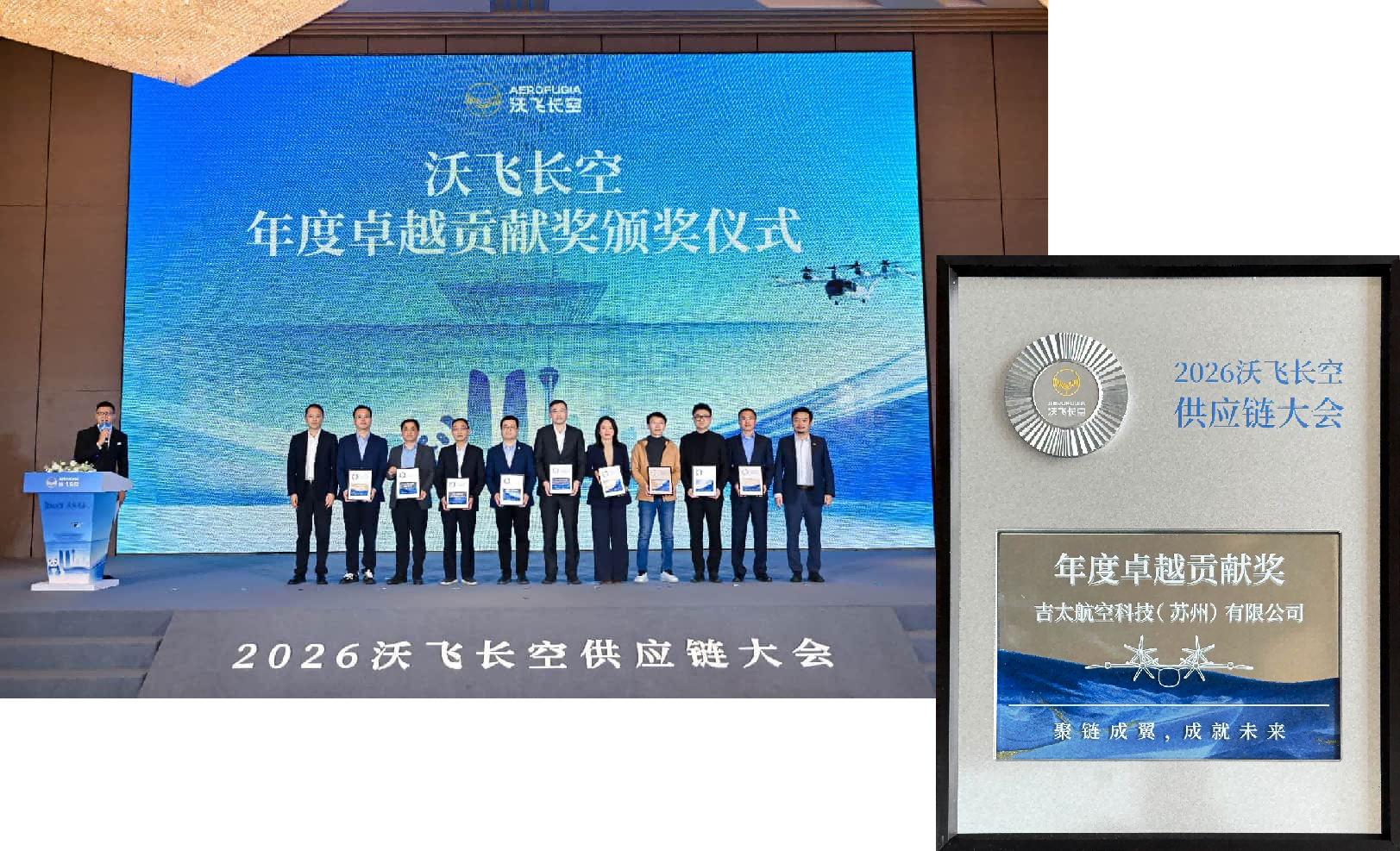 吉太航空科技(苏州)有限公司受邀出席本次盛会,并凭借在eVTOL航电与空地通信领域的深度协同、稳定交付与技术支撑,荣获年度卓越贡献奖,成为沃飞长空低空经济产业链核心供应商标杆伙伴。